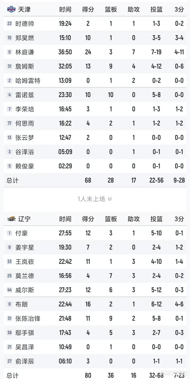 末节决战,布朗开局失误,天津队反击三分投进分差回到个位数,鄢手骐反击迅速回敬两分,弧顶天津队三分再进手感爆发,布朗持球漂移三分回敬,暂停回来双方陷入防守大战,姜宇星底角三分投进分差回到12分,吴昌泽在禁区篮板拼抢积极,张陈治锋关键2+1杀死比赛,最终辽宁80-68战胜天津!
